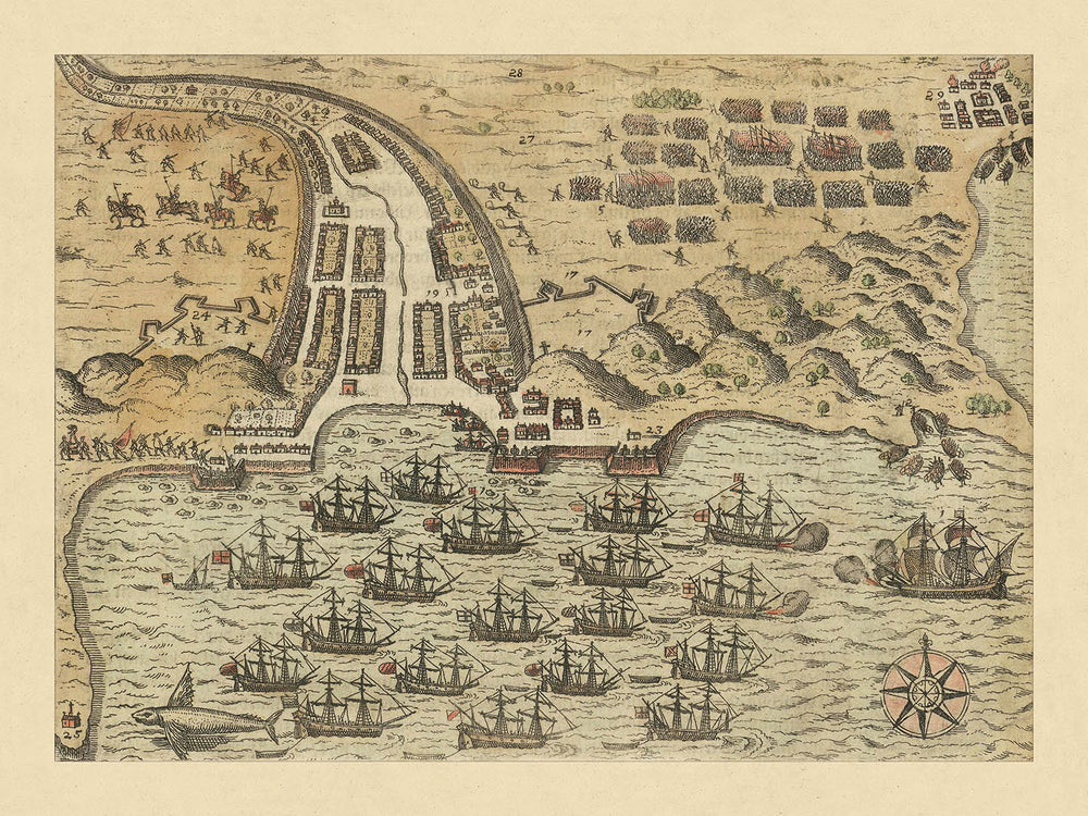 Sir Francis Drake's Attack on Santiago by De Bry, 1599: Battle Map, Fleet, Troops, Fortifications
