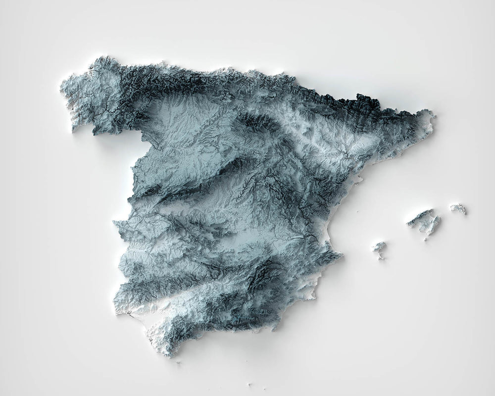 At the heart of the country, the Meseta Central emerges—an expansive and elevated plateau that defines much of Spain’s interior. Gentle gradations in relief showcase how this vast plain is encircled by mountain systems: the rugged Sistema Central slices across the plateau, while the dramatic Sierra Morena stands guard to the south. Intricate shadowing captures the smooth rise and descent of these ancient uplands, while the river valleys of the Douro, Tagus, and Guadiana wind their way through the landscape, etching deep lines across the plateau.
