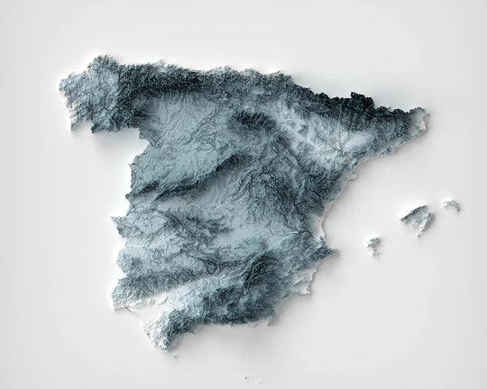Along the eastern Mediterranean and southern coasts, the land dips and lifts again, revealing coastal sierras that tumble towards the sea. Here, the subtle use of shading picks out the abrupt escarpments and narrow coastal plains, revealing the dynamic meeting of mountain and shoreline. From the Balearic Islands off the coast to the dry, rolling hills of La Mancha and the lush landscapes of Galicia in the northwest, every contour is picked out in fine detail, celebrating the extraordinary variety of Spain’s geography. This is a map that honors Spain’s wild heights, sweeping valleys, and storied landscapes with artistry and precision.