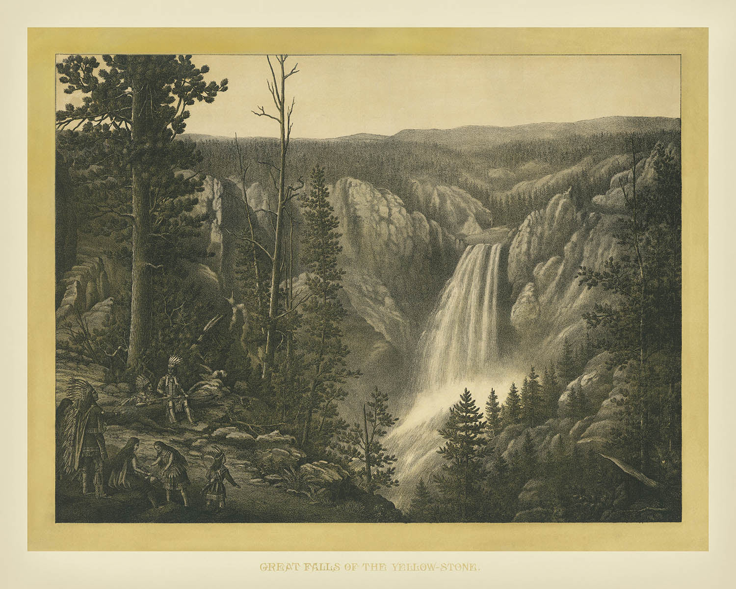 This particular lithograph is celebrated for its rarity and exceptional composition. The expansive view over Yellowstone's magnificent Great Falls is not only visually striking but also historically poignant, encapsulating the awe-inspiring grandeur of America's first national park. The presence of Native Americans in the foreground provides a narrative richness, reminding viewers of the profound connection between the land and its original inhabitants.