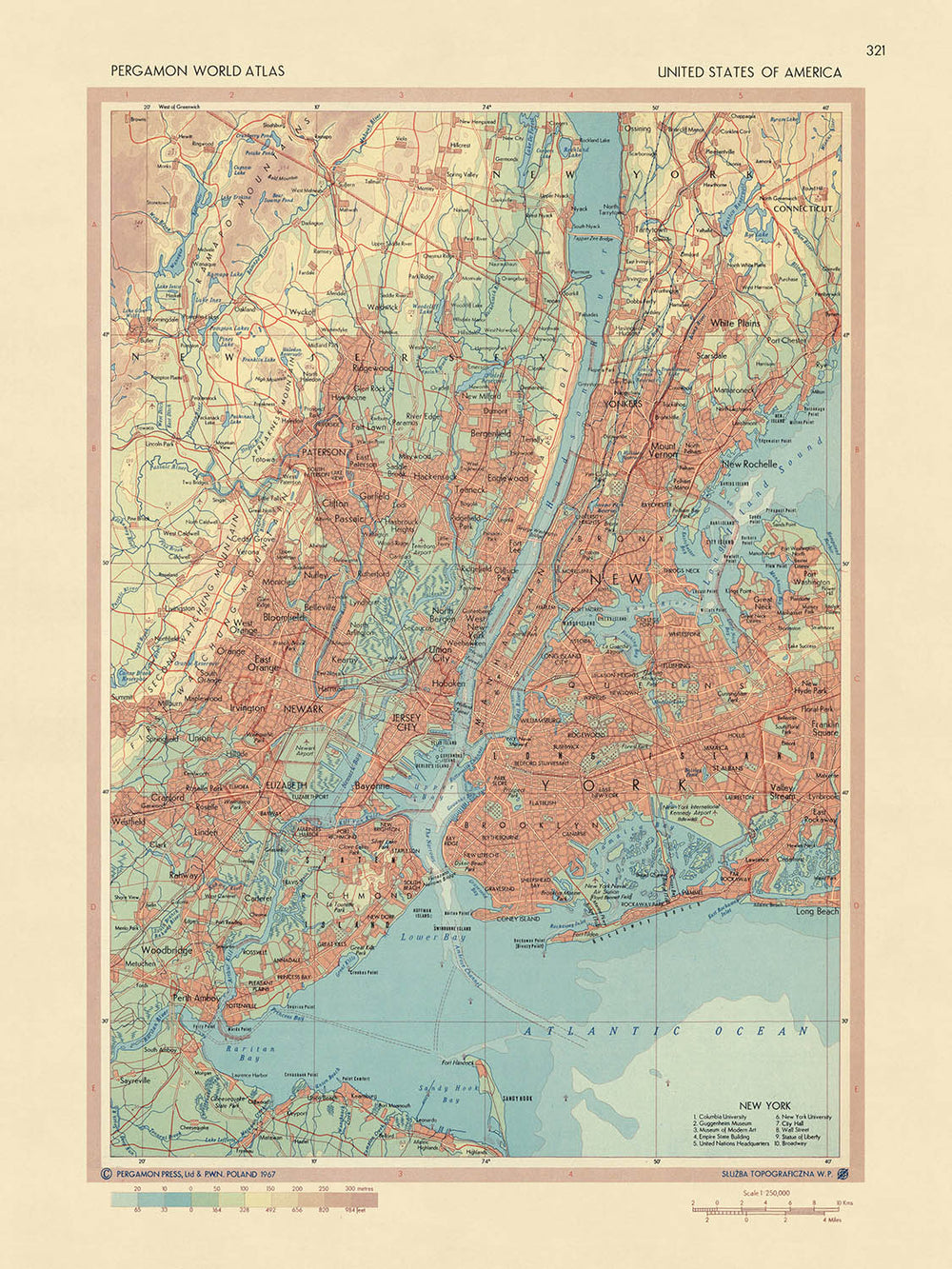 This captivating piece of cartography, titled 'New York City Vicinity', is an artifact of historical significance. Published in 1967 by the Polish Army Topography Service, the map presents a detailed political and physical representation of New York City. The map captures the essence of the city, displaying all of its vibrant neighborhoods and regions, from Manhattan and Brooklyn to The Bronx, Newark, and Jersey City. The map also extends its coverage to include Jersey City, Paterson, and Yonkers, reaching as far as Sandy Hook Bay in the south and East Rockaway in the east.