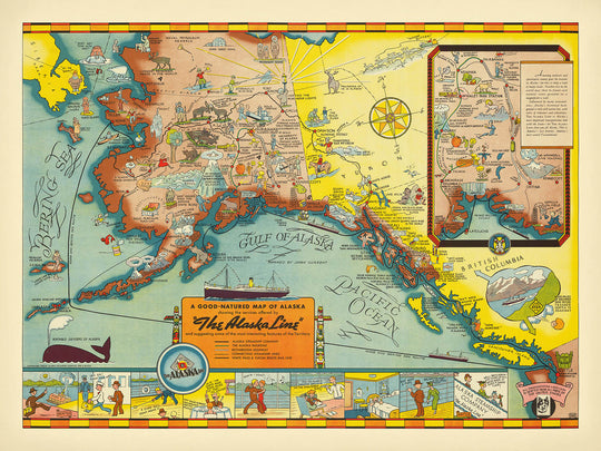 A captivating piece of cartographic history, "A Good-Natured Map of Alaska" by Edward Camy, transports viewers to the vibrant and whimsical world of 1940s Alaska. Originally crafted for the Alaska Steamship Company, this map offers a delightful blend of artistry and information, highlighting the services of "The Alaska Line." Camy's playful style is evident in the colorful caricatures and detailed illustrations that adorn the map, making it not just a navigational tool but a piece of art that captures the imagination.
