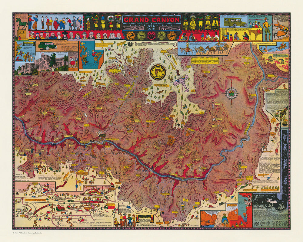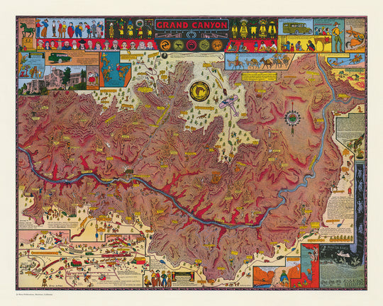 Immerse yourself in the rich history and breathtaking beauty of the Grand Canyon with Jo Mora's Pictorial Map of Grand Canyon, crafted in 1931. This extraordinary map is a visual masterpiece that offers a detailed and whimsical exploration of one of the world's most iconic natural wonders. Jo Mora, an artist renowned for his intricate and illustrative maps, has captured the essence of the Grand Canyon through a series of marvelous vignettes, depicting major landmarks and historical elements that make this region so captivating.