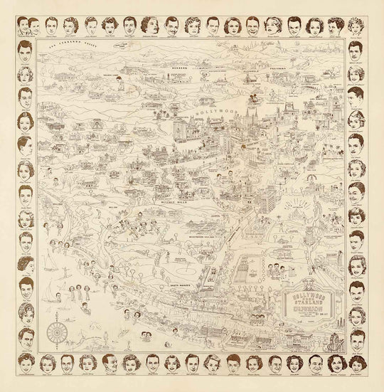 Titled "Starland", this gorgeous pictorial map illustrates Hollywood as the land of the stars, where you can see the faces, homes and workplaces of all the stars.
