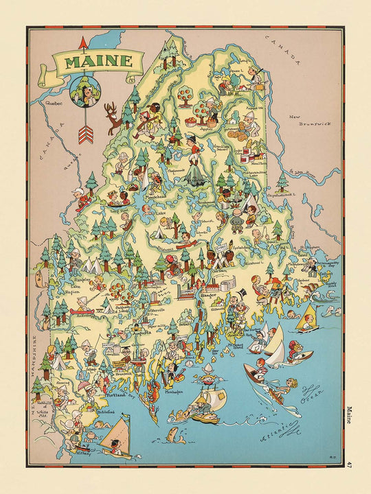 Step into the whimsical world of 1930s Americana with "Maine," the original title of this enchanting pictorial map created by Ruth Taylor White in 1935. This captivating cartographic piece stands as a testament to a bygone era, when mapmaking was as much about storytelling and artistry as it was about navigation. The map is a vibrant celebration of Maine’s unique identity, brought to life through a delightful array of colorful illustrations that capture the spirit and character of the Pine Tree State. From its bustling coastal towns to its tranquil forests, every inch of the state is rendered with playful detail, making this map a visual feast for both collectors and lovers of history.