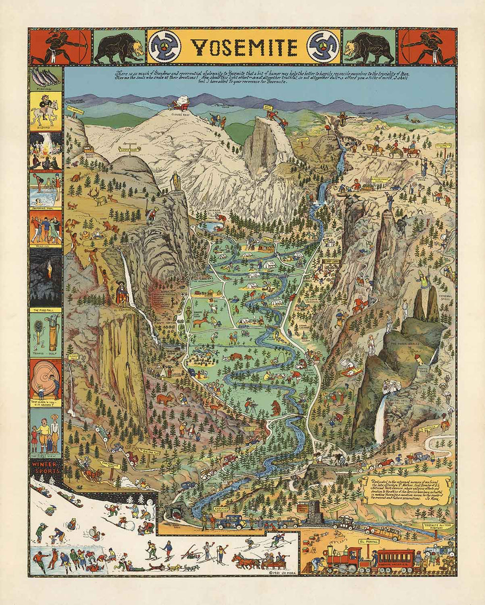 This wonderful old map of Yosemite National Park was originally published in 1941. It was created by Jo Mora.