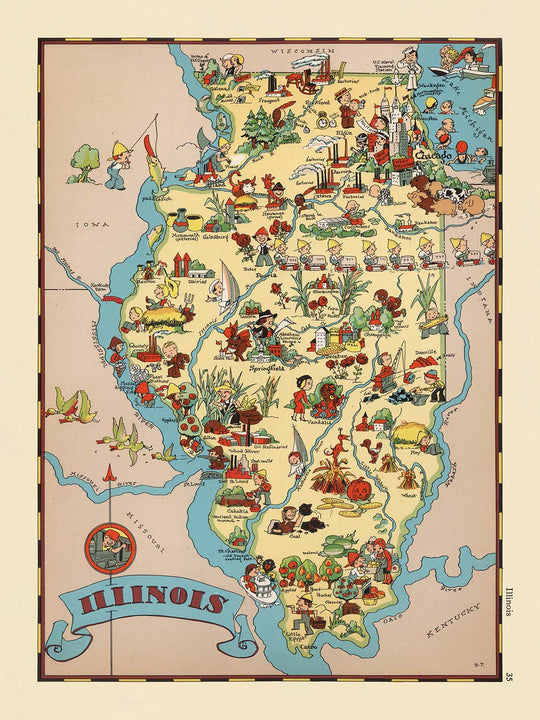 Step into the vibrant world of 1930s America with “Illinois,” the original title of this captivating pictorial map created by Ruth Taylor White in 1935. A true celebration of the Prairie State, this map is a centerpiece from a celebrated series of whimsical atlases that brought each U.S. state to life through bold colors and playful illustration. With its vivid, cartoon-like style, the map is more than a geographic reference—it is a visual narrative, capturing the energy, optimism, and spirit of Illinois during a transformative era in American history.
