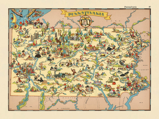- The map uses vibrant, colorful illustrations and cartoon-like depictions to represent Pennsylvania's culture, landmarks, and activities as seen in the 1930s.