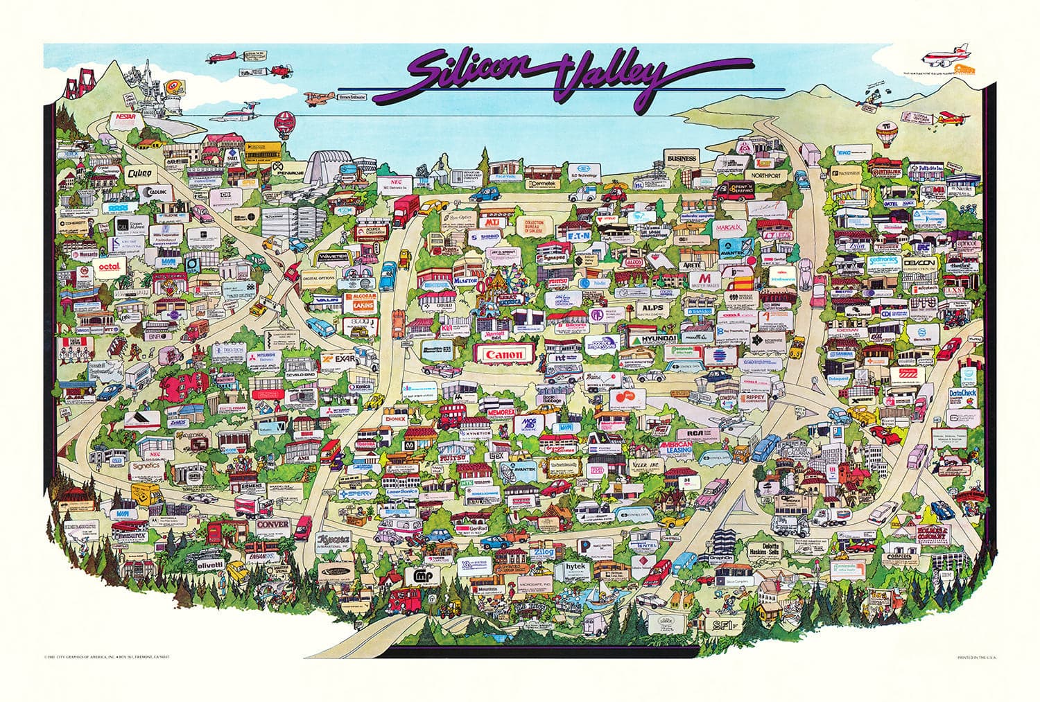 Rare Old Map of Silicon Valley, 1985: Pictorial Chart of Mountainview, Sunnyvale, Cupertino, San Jose, Fremont