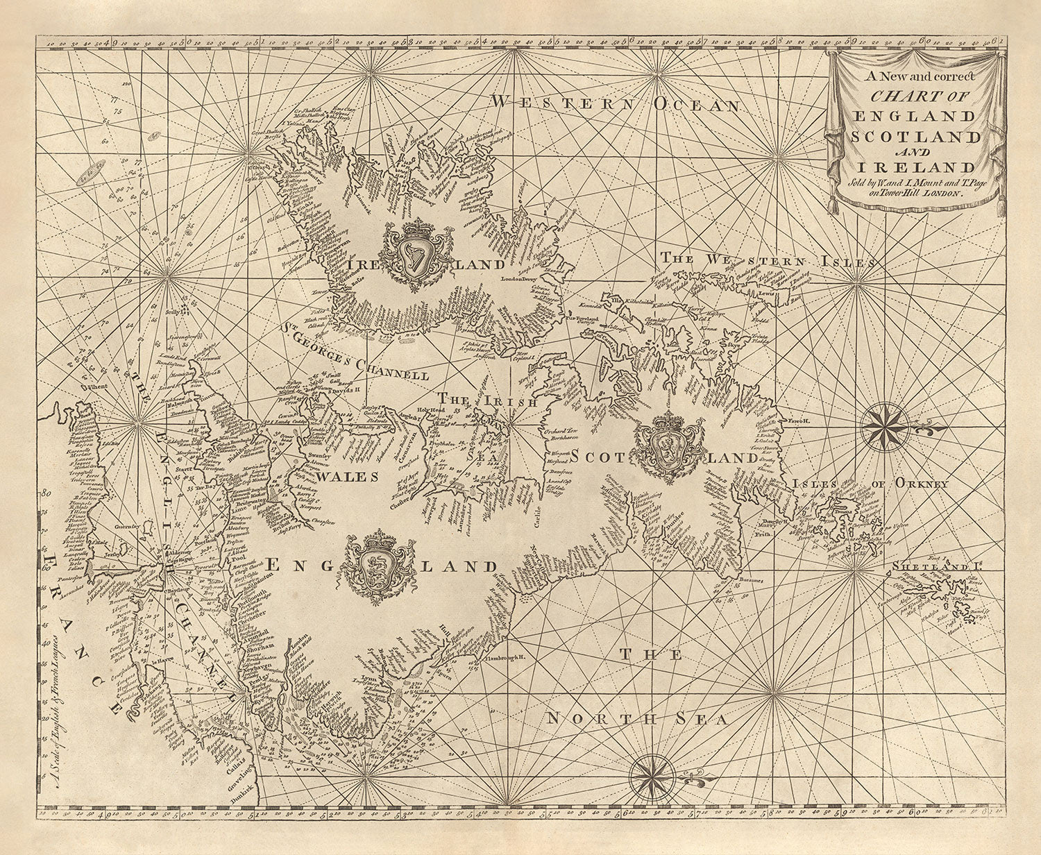 This wonderful old map of a sea navigation chart of the British Isles was originally published in 1752. It was created by Page & Mount.