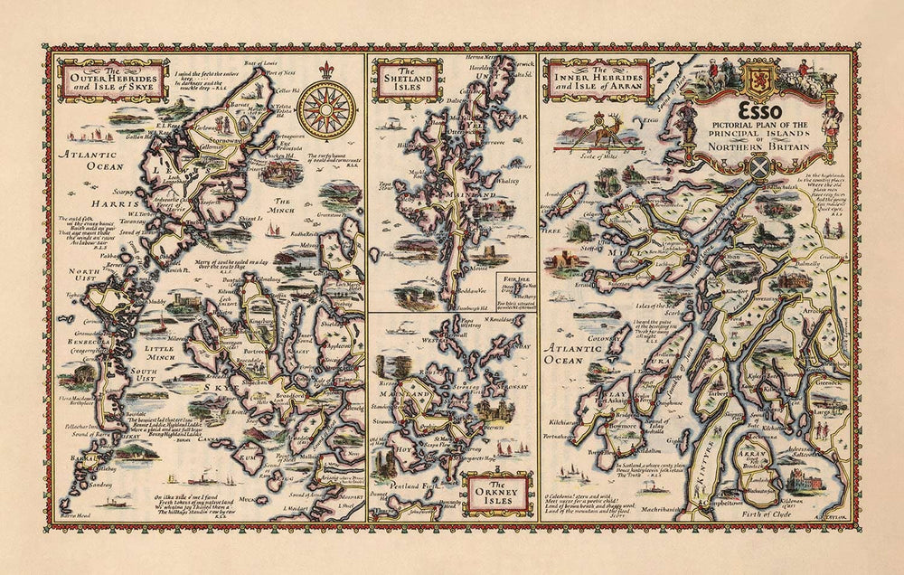 This rather fascinating pictorial map of the "Principal Islands of Northern Britain" was created by A.E. Taylor and published in 1933 by Esso - which was known as Standard Oil in the US and only a few months previous as Pratts Oil in the UK.