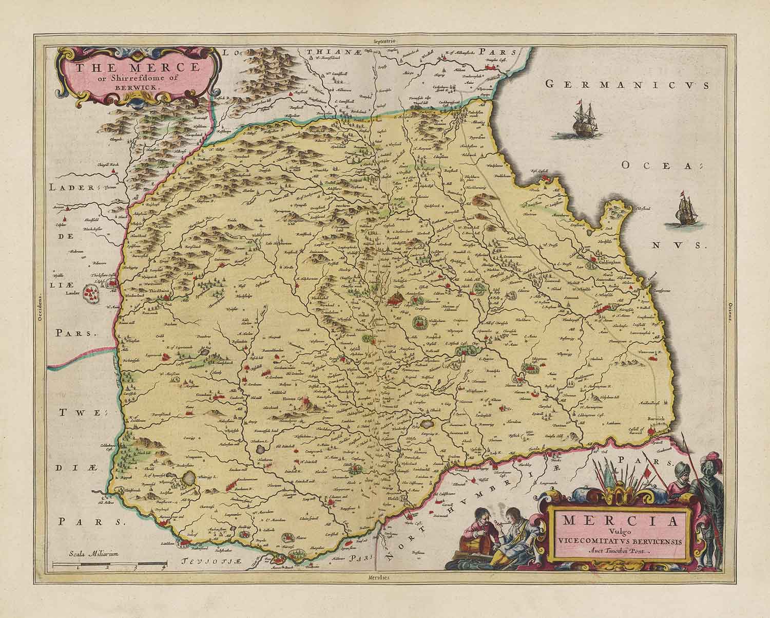 This exceedingly rare, old full colour map of the county of Berwick in Scotland was created by master mapmaker Joan Blaeu from his workshop in Amsterdam and originally published in 1665 as part of his Theatrum Orbis Terrarum Sive Atlas Novus.