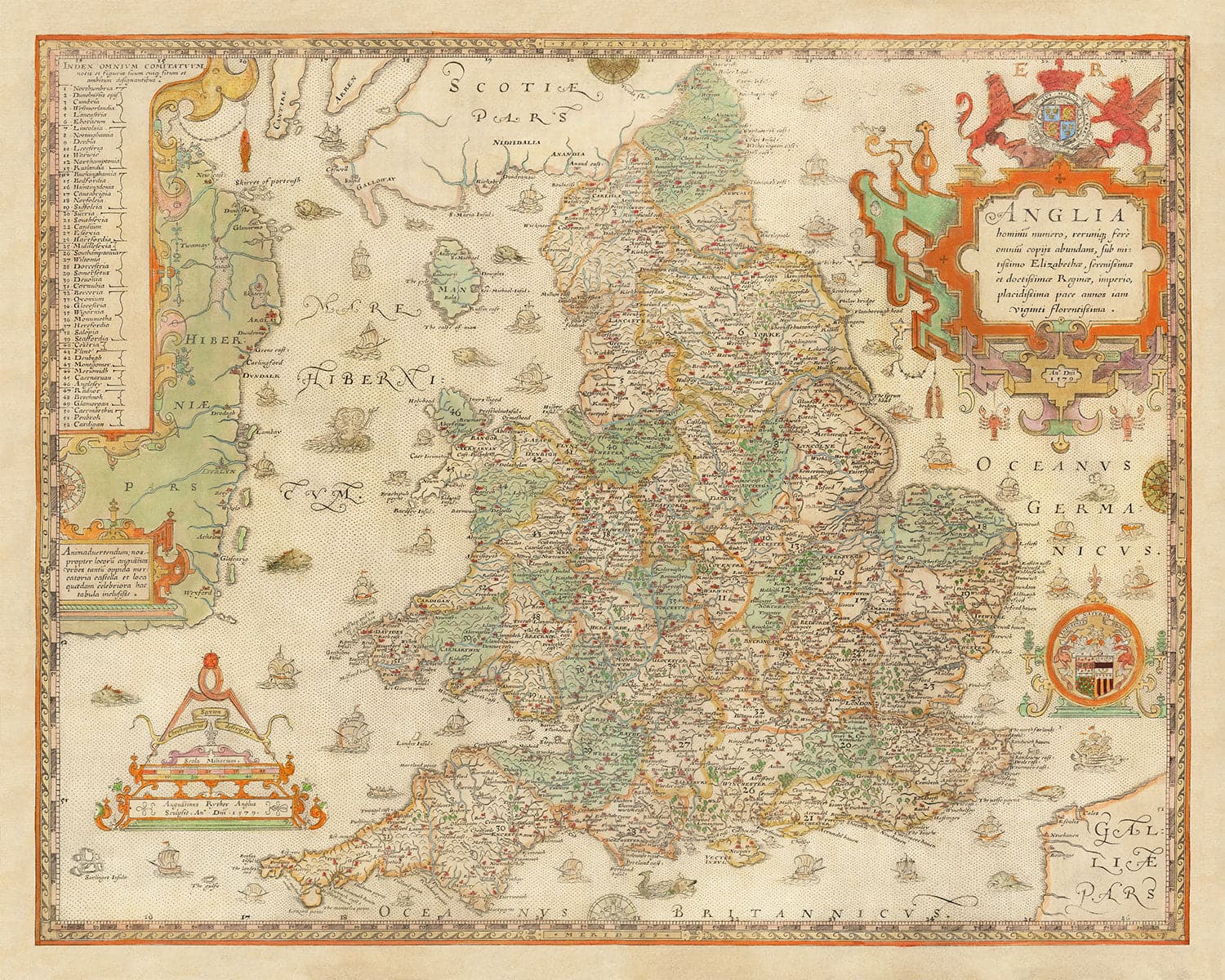 Old Map of England & Wales, 1579 by Christopher Saxton: First Printed Map of British Isles
