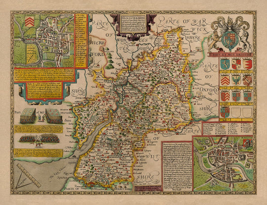Many of the towns, villages and cities in Gloucestershire are already visible in this map. Back in 1611 Gloucestershire was a bit larger. Today, South Gloucestershire and Bristol have been split off, and some of the northern stretches have become Warwickshire.