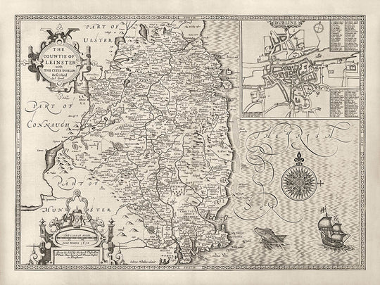 Old Map of Leinster, Ireland in 1611 by John Speed: County Dublin, Kilkenny, Meath, Drogheda