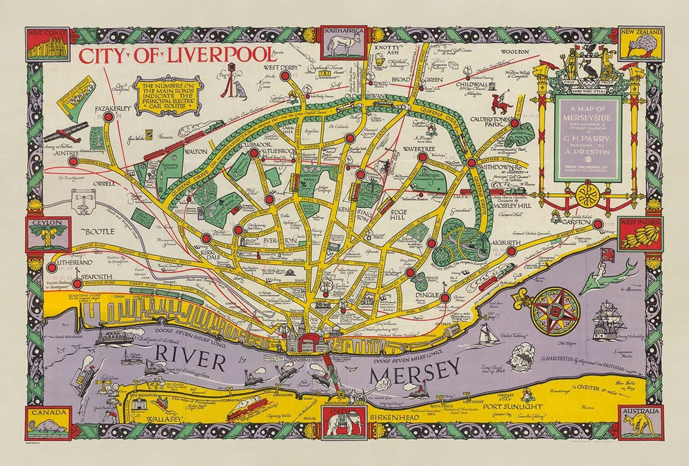 This beautiful and absolutely unique pictorial map of Liverpool was published in 1934 by GH Parry.