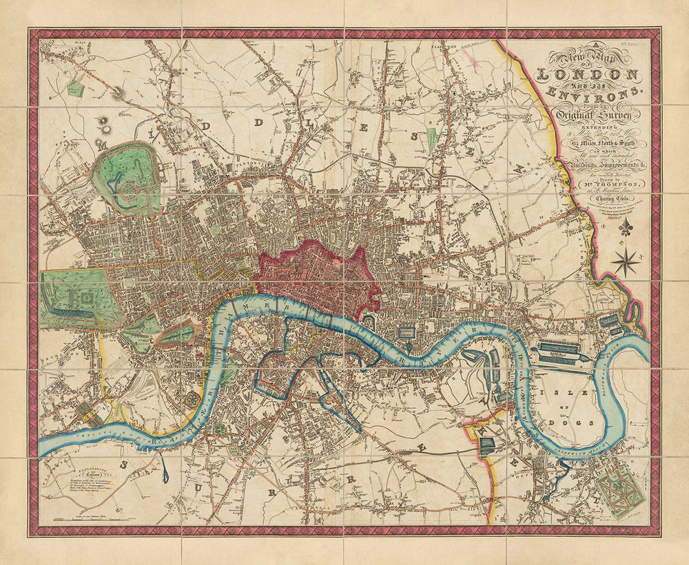 Old Map of London and Environs in 1822 by Thompson: Isle of Dogs, Bermondsey, Deptford, Covent Garden, Westminster