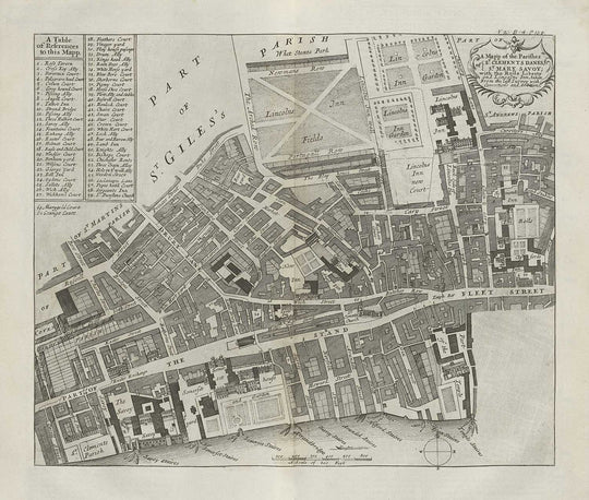 This survey map focuses primarily on the Parishes of St Mary Savoy and St Clement Dane in the borough of Holborn, where you can see Lincoln Inn Fields as well as the River Thames at the bottom of the map. You can already see The Savoy on the bottom left of the map, which at the time was a manor and liberty.