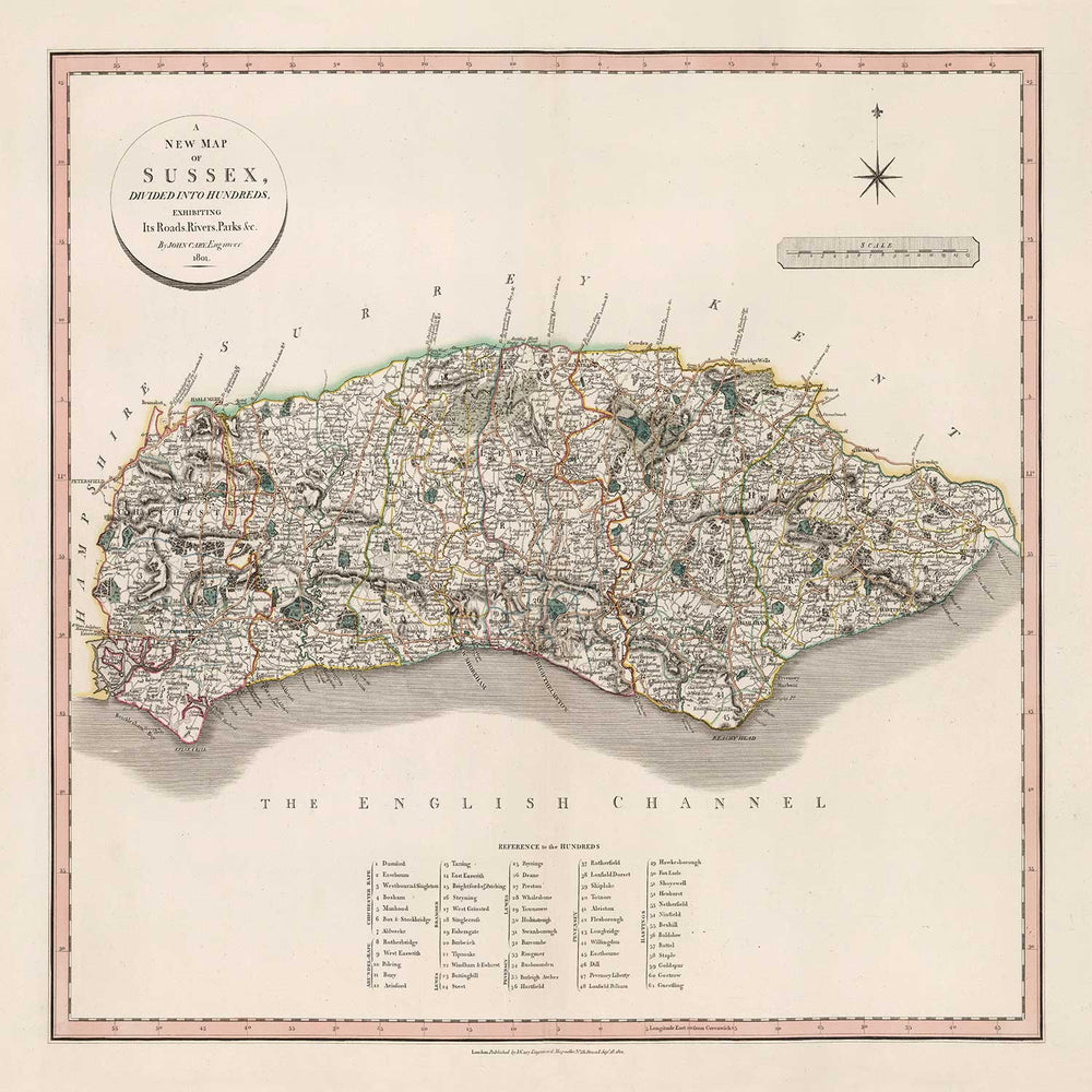 This old map of Sussex, created by John Cary in 1801, provides a fascinating glimpse into the county's rich history. At the time this map was made, Sussex was a thriving agricultural region, with numerous small towns and villages scattered throughout the countryside. Some of the most notable landmarks on the map include the ancient town of Lewes, which was founded by the Saxons in the 5th century, and the historic city of Chichester, which was an important Roman settlement.