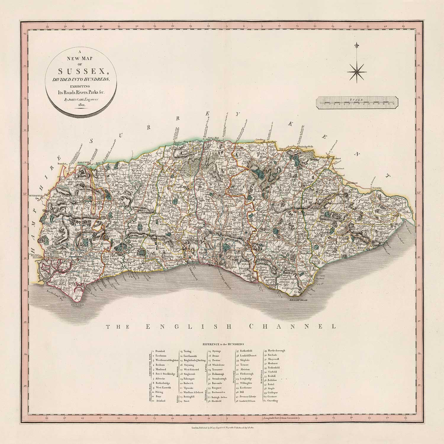 This wonderful old map of Sussex was originally published in 1801. It was created by John Cary.