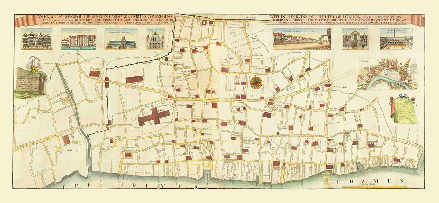 This wonderful old map of the Great Fire of London was originally published in 1667. It was created by John Leake & George Vertue.