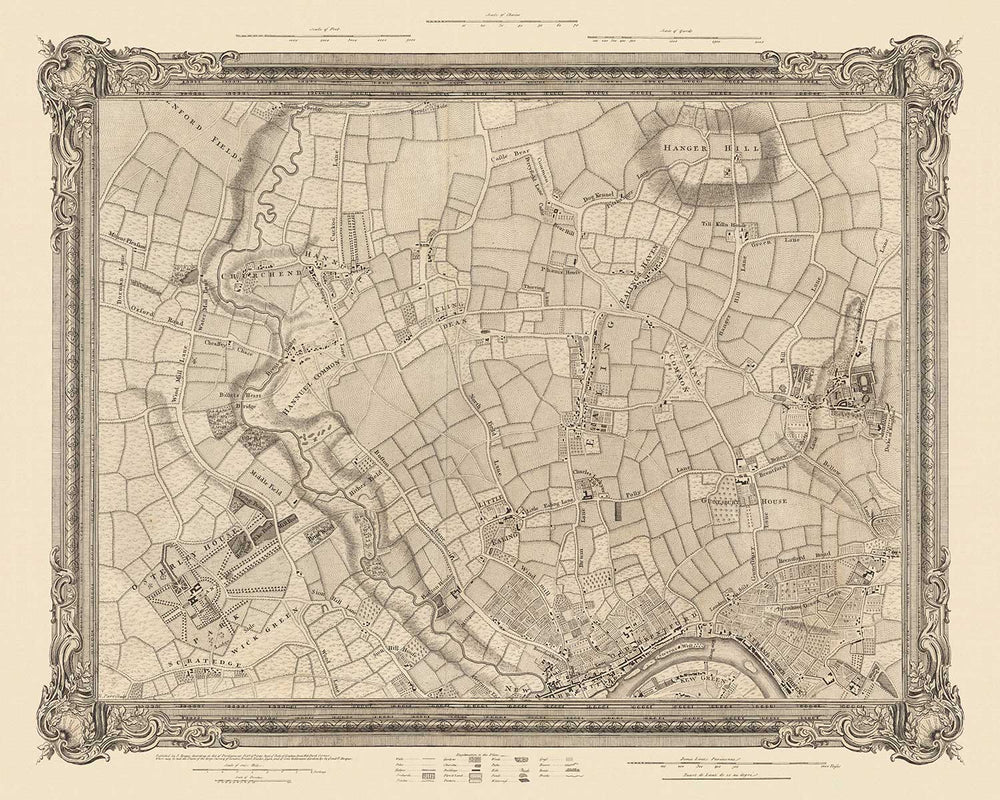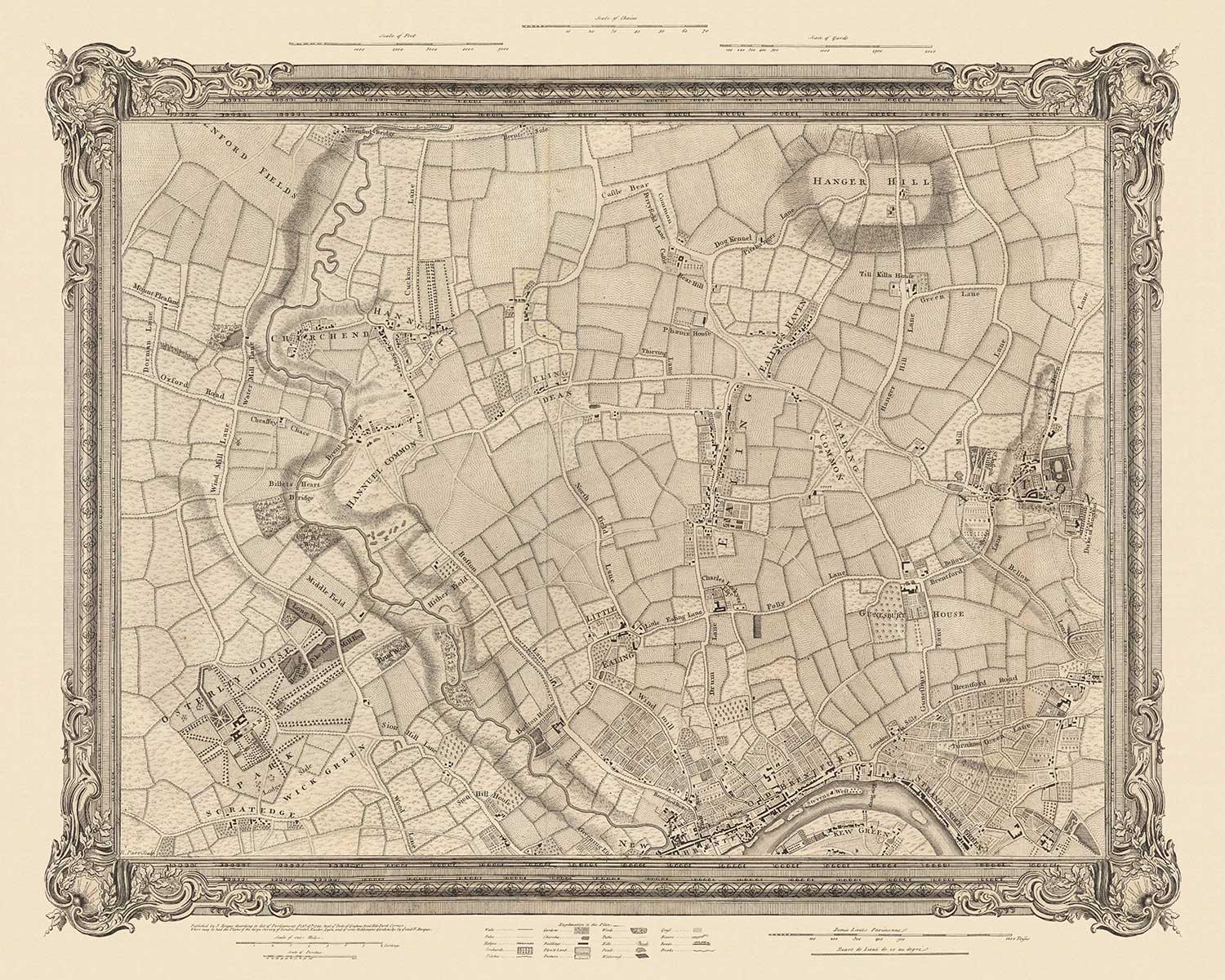 Old Map of West London in 1746 by John Rocque: Brentford, Ealing, Acton, Hanwell, Chiswick, W3, W4, W5, W7, W13