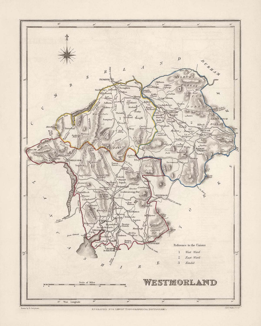 Old Map of Westmorland by Samuel Lewis, 1844: Appleby, Kendal, Kirkby Stephen, Brough, Lake District