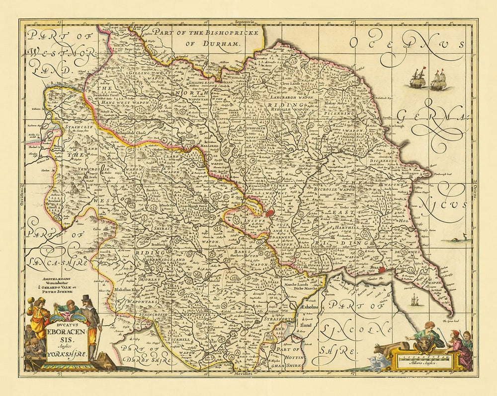 This delightfully handcoloured, detailed and extremely rare map of the entirety of Yorkshire was originally published in 1690 by Valk & Schenk, a master mapmaking duo that worked out of Amsterdam in the 17th century.
