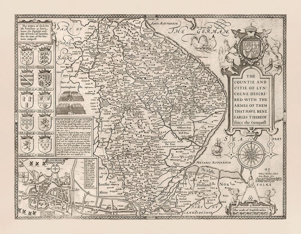 This old, exceedingly rare monochrome copperplate map shows the ancient county of Lincolnshire as it was in 1611. It was created by John Speed and engraved by Jodocus Hondius, and originally published in Speed's "The Theatre of the Empire of Great Britaine".