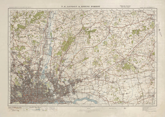 This old Ordnance Survey map, Sheet 107 - N.E. London & Epping Forest, is a fascinating piece of cartographic history from the renowned One-inch "Popular" edition, England and Wales, published in 1925. The map showcases the northeastern part of London, including the sprawling Epping Forest, along with several significant towns and cities such as Brentwood, Romford, West Ham, Enfield, and Finchley.