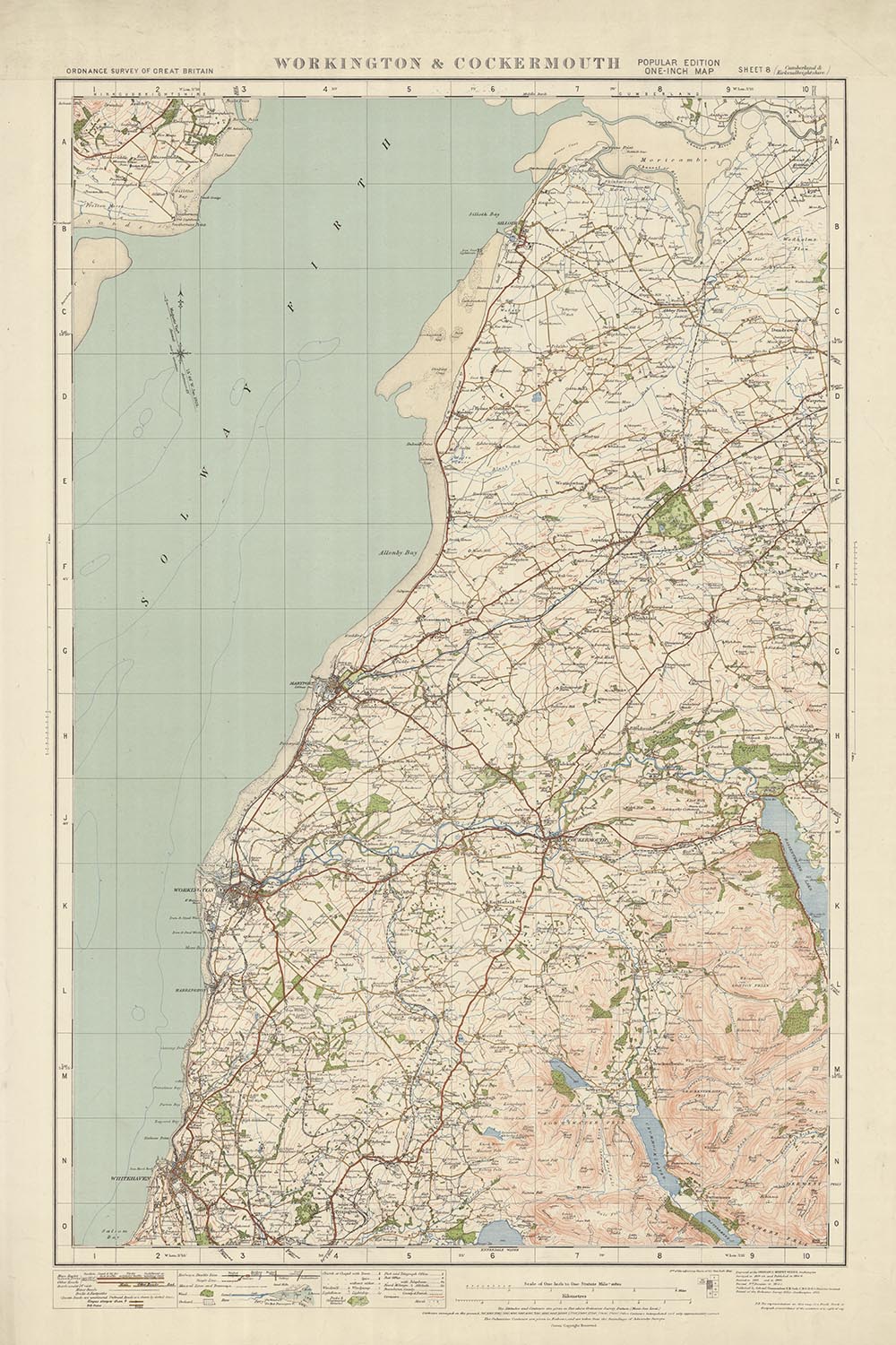 This meticulously crafted old map, titled "Sheet 8 - Workington & Cockermouth," is a remarkable piece from Ordnance Survey's One-inch "Popular" edition of England and Wales, published in 1925. It offers a fascinating glimpse into the past, showcasing the towns, cities, and intriguing features of the area. The map covers the historic county of Cumberland, where the vibrant towns of Workington and Cockermouth are located.