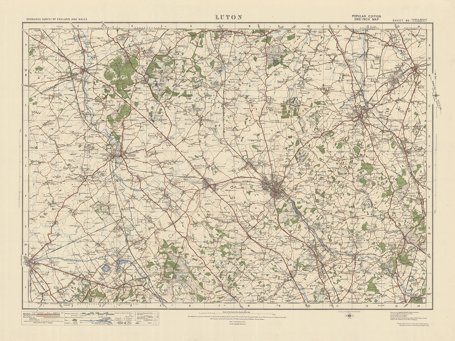 Immerse yourself in the rich history and geography of Luton and its surrounding areas with the "Sheet 95 - Luton" map from Ordnance Survey's One-inch "Popular" edition, England and Wales, published in 1925.