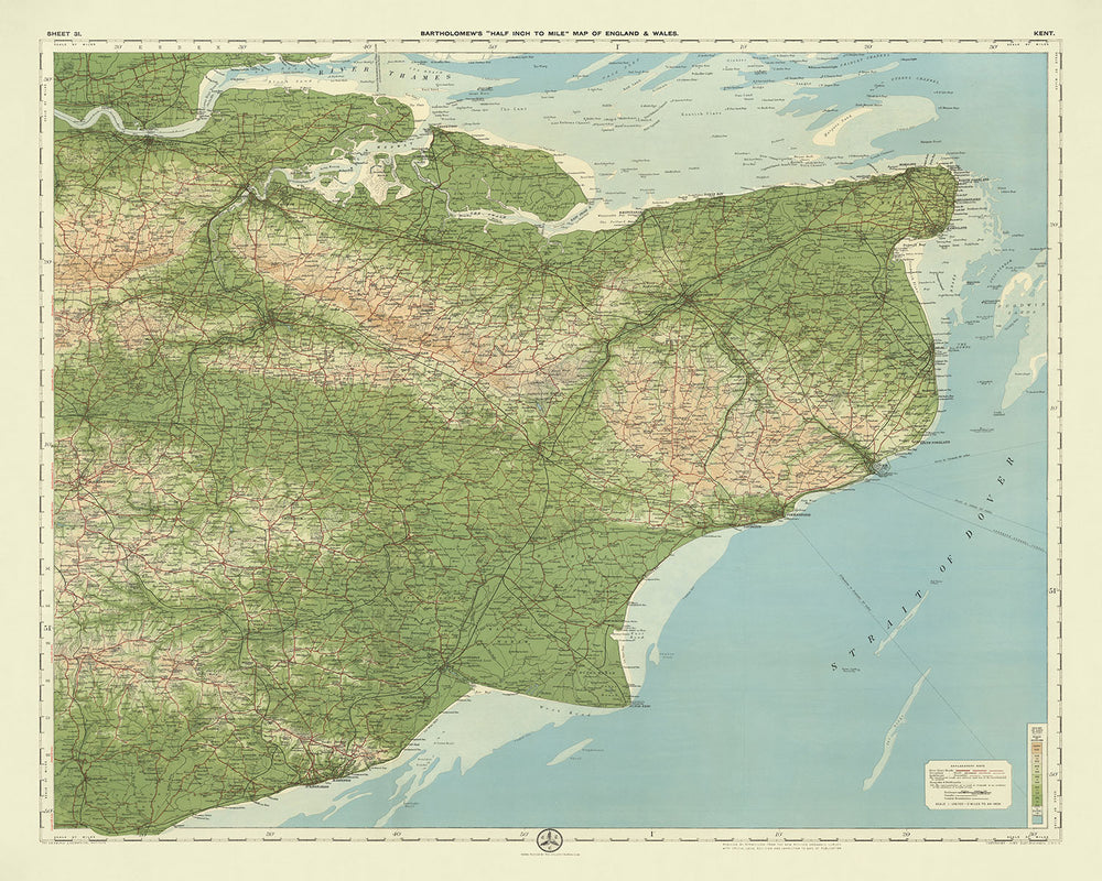 The map's design is both functional and aesthetically pleasing, showcasing Bartholomew's signature style of using different layers of color to represent landscape relief. This innovative approach allows viewers to easily discern the topographical nuances of Kent, from the rolling North Downs to the dense forestlands of the Weald. The map's clarity and attractiveness are further enhanced by its detailed political and physical features, making it not only a practical tool for navigation but also a work of art in its own right.