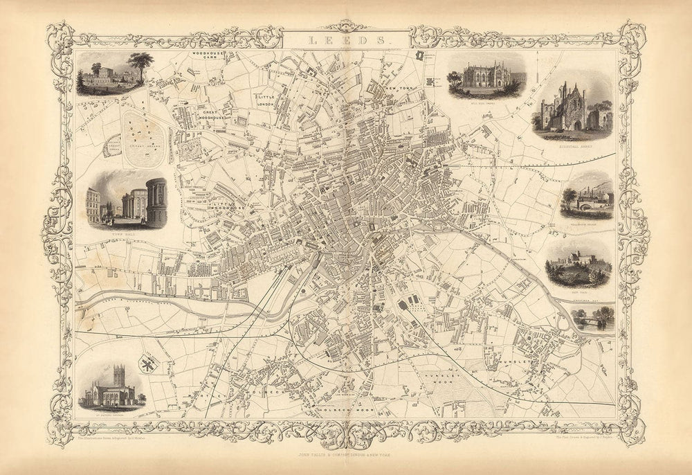 Rare Old Map of Leeds in 1851 by John Rapkin