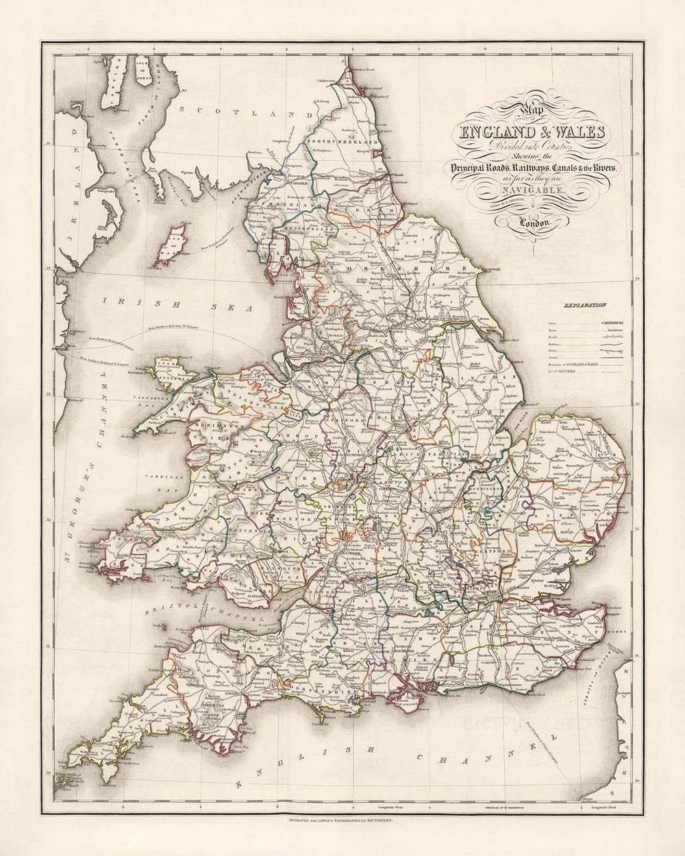 The map is also a celebration of human settlement and achievement, charting the locations of England and Wales’s most storied cities and towns. From the bustling metropolis of London to the industrial powerhouses of Birmingham, Manchester, and Liverpool, each settlement is carefully positioned, reflecting its prominence in the national tapestry. Smaller but no less significant towns—York, Oxford, Cambridge, Exeter, Cardiff, Swansea, and many more—are also featured, their names echoing centuries of history, culture, and local identity. The inclusion of bridges, canals, and early railroads further highlights the era’s spirit of innovation and connectivity.