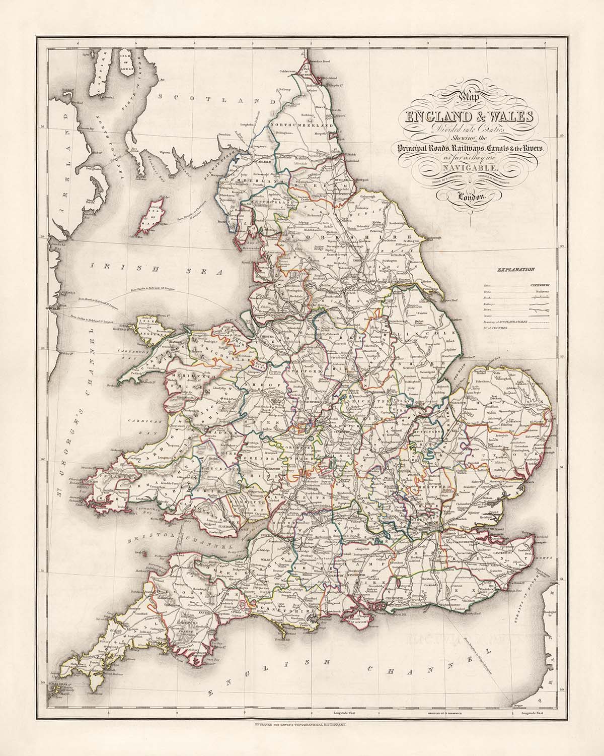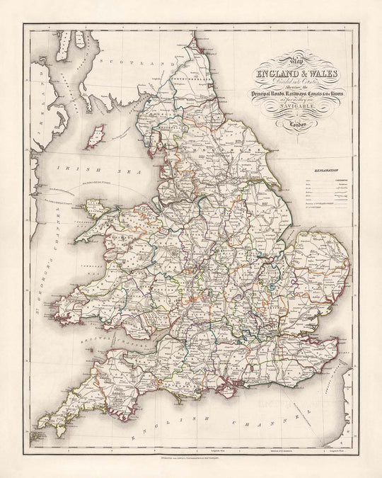 Step into the intricate world of Victorian cartography with Samuel Lewis’s “Map of England & Wales: Divided into counties,” a masterwork first published in 1844. This meticulously hand-colored map was created to accompany Lewis’s renowned Topographical Dictionary, a monumental reference work that sought to capture the ever-evolving landscape of 19th-century Britain. The map’s original purpose was both practical and scholarly: to illuminate the intricate patchwork of counties, administrative borders, and transportation routes that defined the nation at the dawn of the railway age. Its detailed legend and precise lines invite the viewer to explore the England and Wales of a bygone era, where every county boundary and waterway was drawn with care and intention.