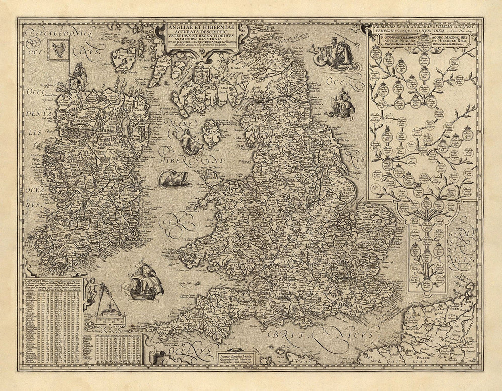 Ireland was rather oddly shaped back in 1605, but all of the major towns and cities are already visible - Cork, Dublin, Belfast, etc. Scotland is just about visible at the top of the map - you can see up to Edinburgh (or Edenburg!) but not much further.