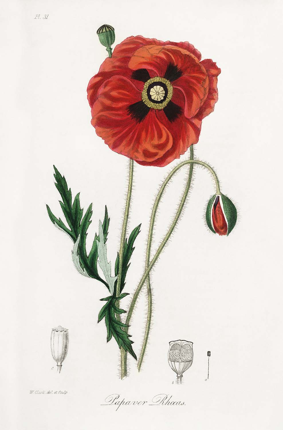 Papaver rhoeas, to give its Latin name, was engraved by William Clark for Medical Botany, an epic book published by noted naturalists and botanists John Stephenson and James Morss Churchill.