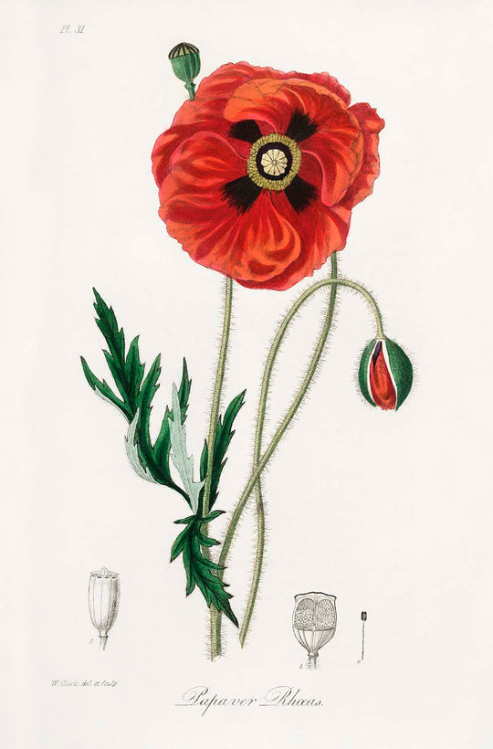 Common Poppy, first published in Medical Botany in 1836, is one of the finest, most beautiful and accurate botanical paintings of a poppy ever published.