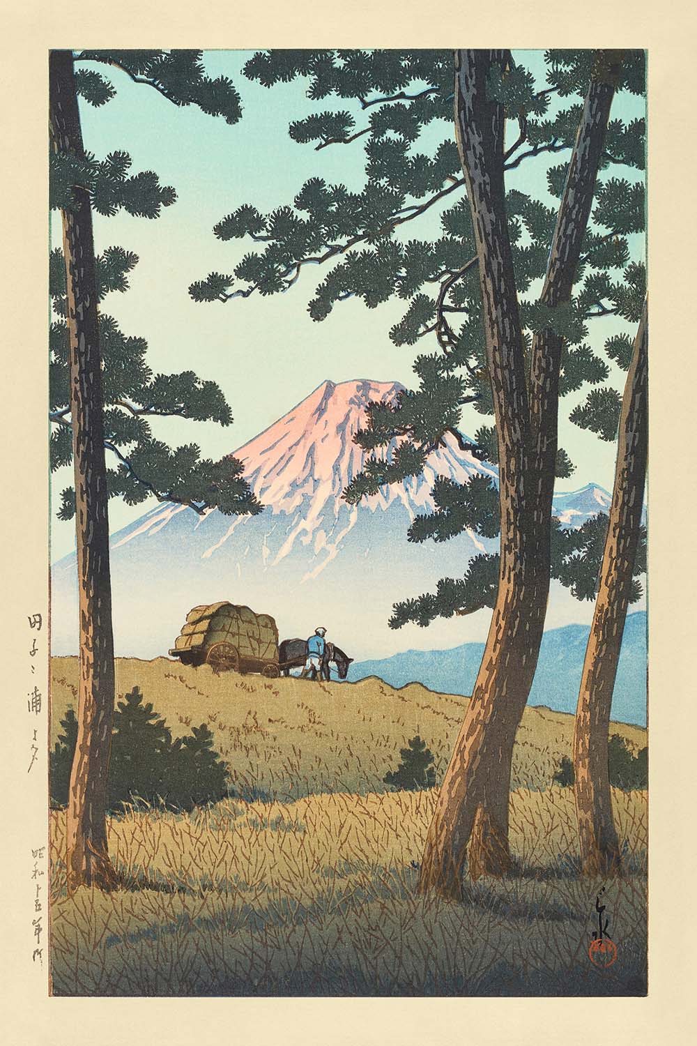 Evening at Tago Bay with Mt. Fuji is especially celebrated for its breathtaking use of color and skilful gradations of tone. Warm, golden pink washes blend seamlessly into radiant yellows along the serene coastal water, all beneath the iconic, gentle form of Mt. Fuji, bathed in the last light of sunset. Lush greens along the shore and soft clouds in the sky enhance the layered composition, guiding the view into a quiet poetry unique to Kawase’s best landscapes. Owning this print means bringing home a moment of peaceful, refined beauty—an emblem of the Japanese harmony between land and spirit.