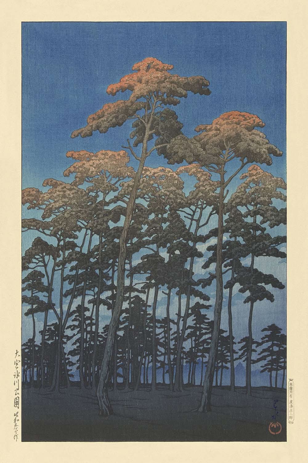 Hikawa Park in Omiya by Hasui Kawase, originally created in 1930, is a testament to the artist's masterful ability to capture the serene beauty of nature with unmatched elegance. Hasui Kawase, a prolific artist in the shin-hanga movement, impeccably blends traditional Japanese art techniques with Western influences, creating pieces that resonate with a timeless tranquility.
