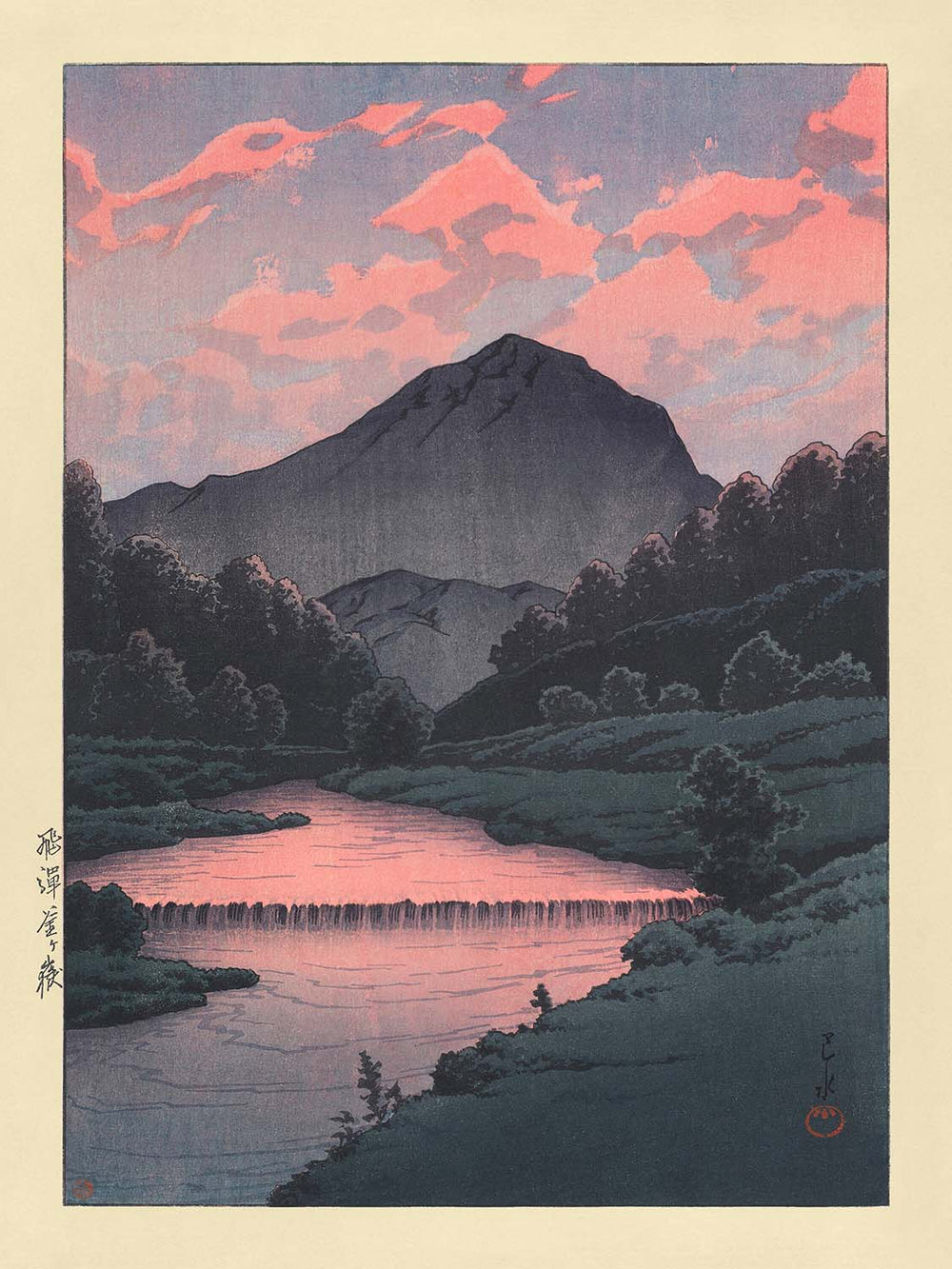 "Mt. Kamaga, Hida" stands as a testament to Kawase's mastery in color. The harmonious blend of dominant pink, complemented by lush greens and hints of purple, creates a scene of dynamic balance and tranquil beauty. The delicate gradations of color embody the softness of dawn touching the mountain peaks, offering viewers a momentary escape into nature's quietude.