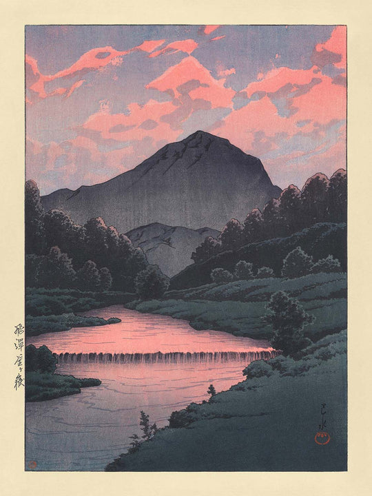Hasui Kawase is distinguished within the Shin-hanga movement, which revitalized Japanese woodblock printing by blending traditional techniques with Western influences in light and perspective. Kawase's works are celebrated for their ethereal beauty and meticulous detail, capturing fleeting moments that evoke a sense of peace and reflection. This print, known in Japanese as "日田釜ヶ岳" (Hita Kamaga-dake), adds not only art but a piece of history to your collection.