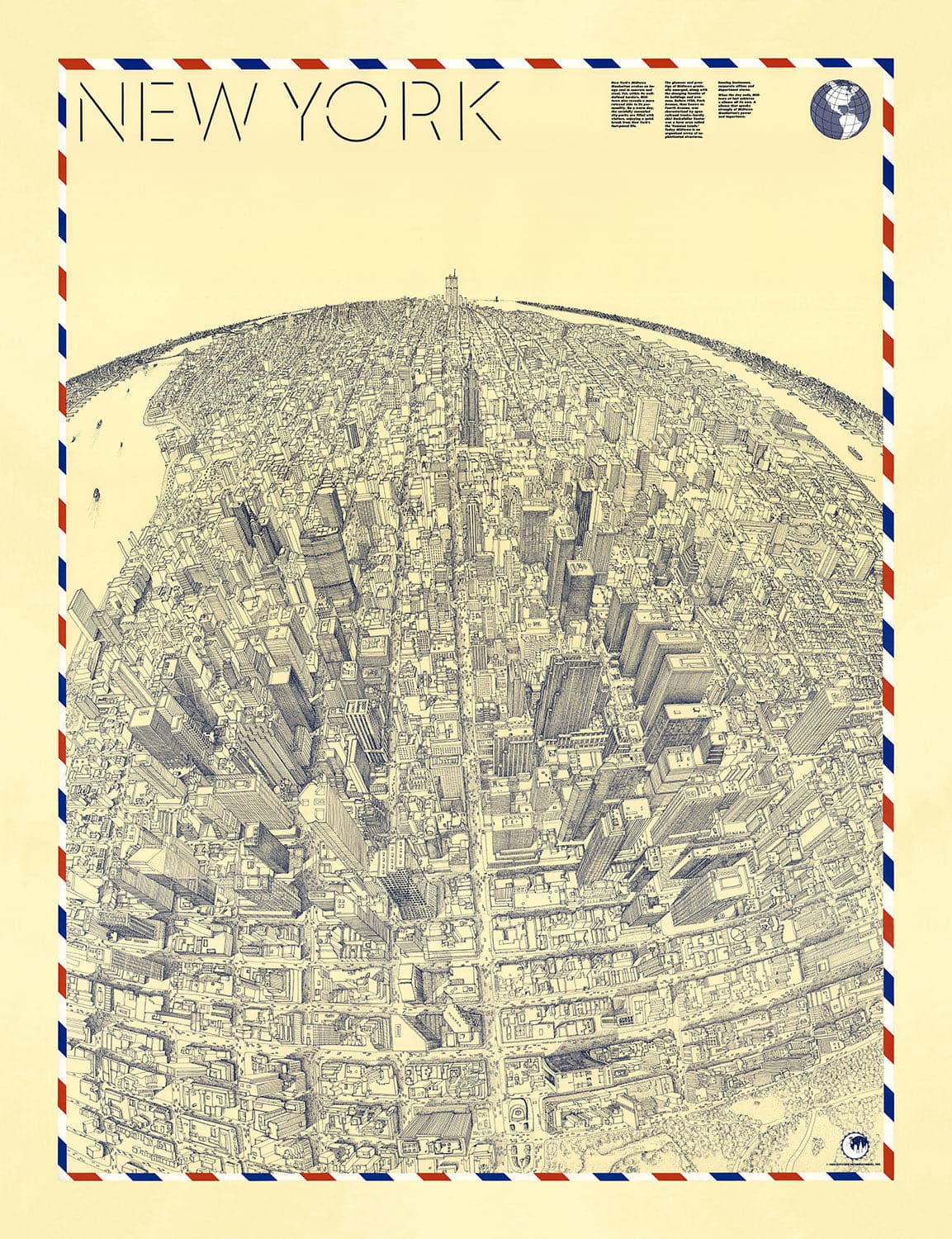 The map looks at the city from a point roughly above the lower edge of Central Park, looking southwest down towards the Financial District and a rather lonely looking Twin Towers.