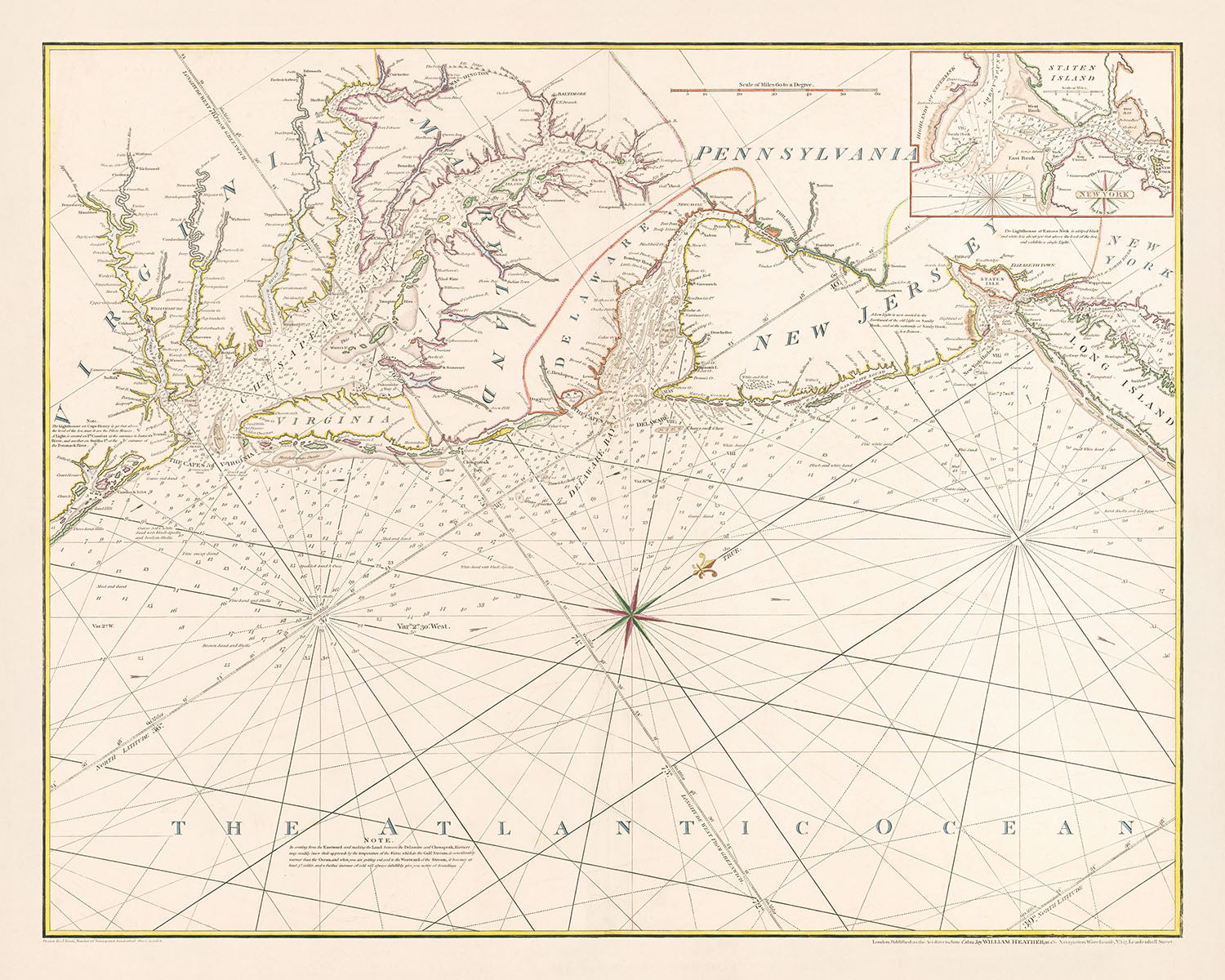 • The map is titled "A Chart of the Coast of North America from Chesapeak Bay to New York Including New York Harbour."