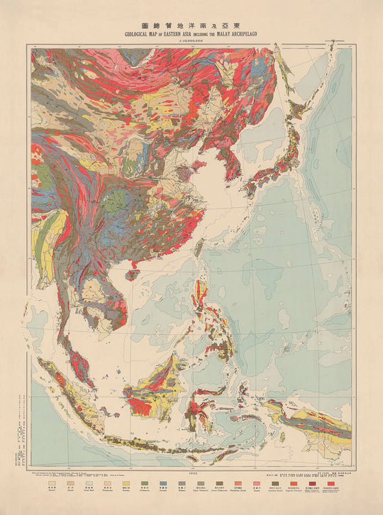Old Geological Map of Eastern Asia and Malay Archipelago in 1932 by Tokyo Geology Society: Japan, China, Indonesia, Vietnam, Taiwan