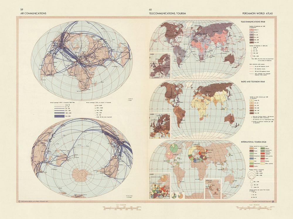 Immerse yourself in the intricacies of global connectivity with the 'World Air Communications. Telecommunications, Tourism.' map, a fascinating historical artifact published in 1967 by the Polish Army Topography Service. As an infographic map, it provides a captivating snapshot of the world's air routes and volumes, along with telecommunications, radio and television, and international tourism data. This thematic style of mapmaking was prevalent during the mid-20th century, a period marked by rapid technological advancements and the dawn of the digital age. The map's richly detailed infographics encapsulate the zeitgeist of this transformative era, offering a unique perspective on the historical context of global communication and travel.