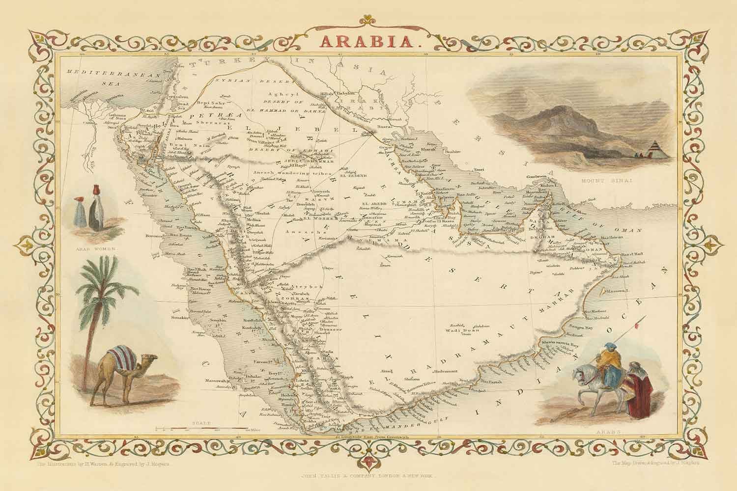 Engraved by John Rapkin and published by J. Tallis & Co in 1851, this is one of the finest and most detailed historic maps of the Arabian Peninsula, or just "Arabia" as it was known back then.