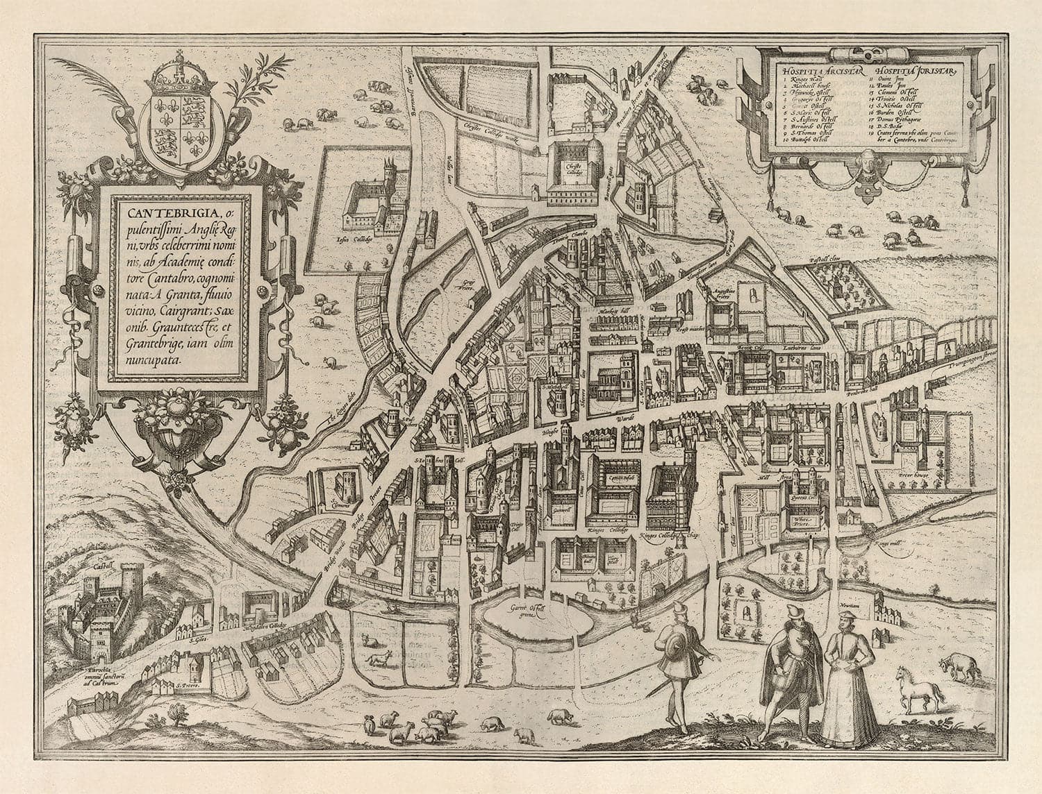 Old Map of Cambridge and University Colleges, 1575 by Georg Braun: Trinity, Kings, Queens, Clare