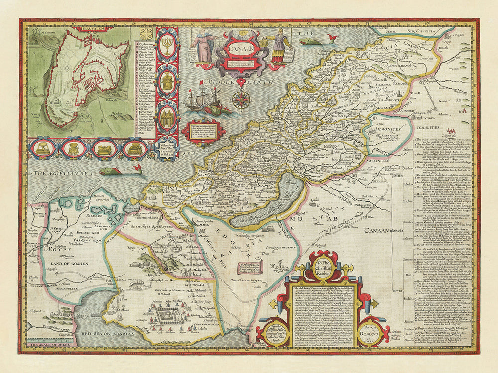 Old Map of Canaan (Holy Land) by John Speed, 1611: Jerusalem, Bethlehem, Nazareth, Samaria, Jericho